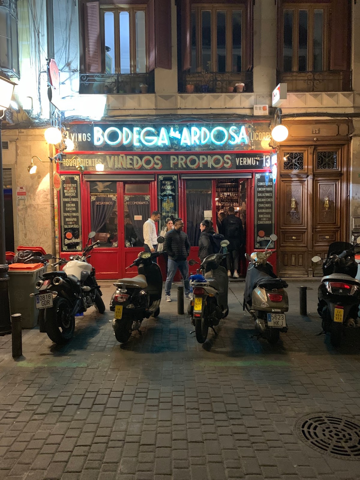 Empezamos a caminar hacia Malasaña pues nos íbamos a juntar con un amigo de Pakistán, nos juntamos en la plaza dos de mayo y luego caminamos hacia la Plaza del Rastrillo para tomar otra cañita en el bar El Balcón de Malasaña. Por último, fuimos a la Bodega Ardosa, dicen que lo mejor para el final y definitivamente fue la mejor comida y en un muy bonito bar. Al llegar a la bodega se puede ver que es solo un pequeño local de medio siglo de edad, pero si pasas atrás de la barra hay más mesas. Ahí pedimos tinto de verano y comimos tortilla de patata, palitos de berenjena en tempura y fritas y alcachofas a la parrilla, estuvo delicioso. Te pasas con tu buena comida. Luego caminamos a Bilbao dejamos a nuestro amigo en su Airbnb y regresamos a casa en Taxi. Ahí agradecí mis amigas el haberme recibido y haberme hecho pasar un fin de semana increíble.